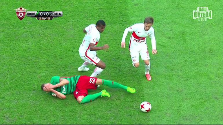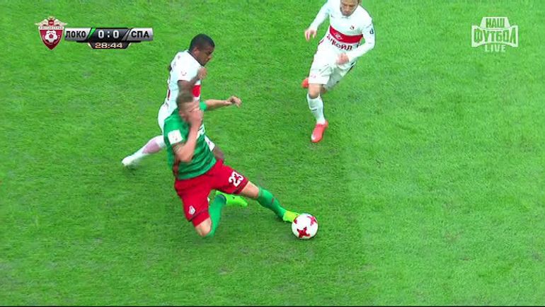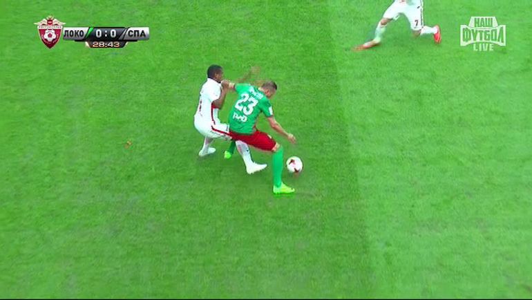Михаил Вилков вынес предупреждение спартаковцу Фернанду, боровшемуся за мяч с Дмитрием Тарасовым. Что стало причиной такого наказания? Возможно, судья обратил внимание на болезненную реакцию железнодорожника. Не исключено, ему показалось, что Фернанду нанес удар локтем, что потом жестом показал Тарасов. На самом деле на видеоповторе видно, что никакого удара локтем не было. Тарасов сам сначала выставил руку и поставил корпус, не пуская соперника к мячу. А затем Фернанду открытой ладонью попал полузащитнику "Локо" сзади в область шеи. Тарасов же почему-то схватился за лицо и упал.