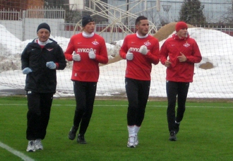 Занятие, продолжавшееся час пятнадцать минут, было посвящено игровым упражнениям. После разминки футболисты провели ряд двусторонних спаррингов на ограниченном участке поля. В отсутствие Стипе Плетикосы, находящегося в сборной Хорватии, оппонентом Джанаева стал тренер вратарей Гинтарас Стауче. |