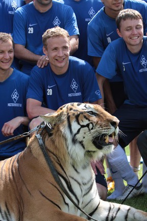 Сегодня тренировочную базу "Крыльев Советов" посетили всемирно известные дрессировщики братья Эдгар и Аскольд Запашные с главной звездой своего цирка - семилетним бенгальским тигром Мартином. Специально к этому самарский клуб выпустил игровую форму с именами братьев Запашных и номером 1. После фотосессии и обмена автографами тигр занял место в воротах, а защитник "Крыльев Советов" Иван Таранов исполнил серию пенальти, часть из которых полосатому хищнику удалось отбить. |