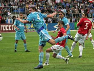 При этом первые полчаса игры ничего подобного не предвещали, хоть соперники и действовали в схожей манере - в сравнении с прошлогодним матчем. "Зенит" указывал хозяевам на то, что преимущество во владении мячом и территорией он им не отдаст, а те при первой же возможности старались угрожать острыми контратаками. Поначалу больше преуспевали красно-белые, ибо питерцы в нападении выглядели излишне академичными. И все же первыми на ошибке соперника подловили гости. Мейра, получив мяч в центре поля, заметил, что Семшов готов выйти на ударную позицию, и точно ему отпасовал, а полузащитнику повезло поймать на противоходе вратаря, бросившегося в момент удара в дальний угол прикрывать ближний. |