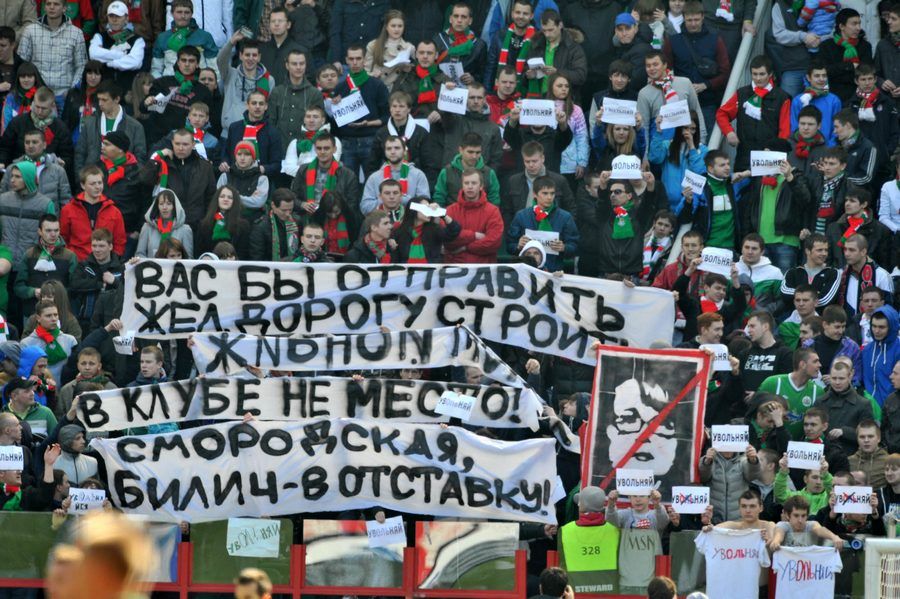 Болельщики "Локомотива", как и обещали, устроили акцию против президента клуба Ольги Смородской. В частности, фанаты подняли листки бумаги с призывом уволить главу клуба. При этом они скандируют оскорбительные лозунги в адрес Смородской. Также фанаты красно-зеленых вывесили баннер с призывом уволить помимо президента главного тренера команды Славена Билича, сопроводив это лозунгом: "Вам бы желдор строить".