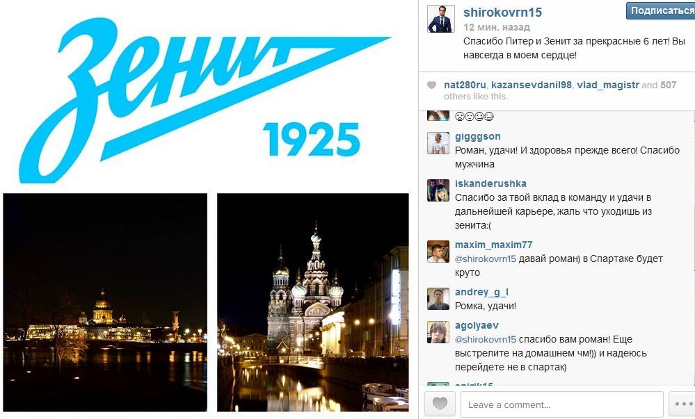 "Спасибо, Питер и "Зенит", за прекрасные 6 лет! Вы навсегда в моем сердце!" – написал Широков в сети Instagram.