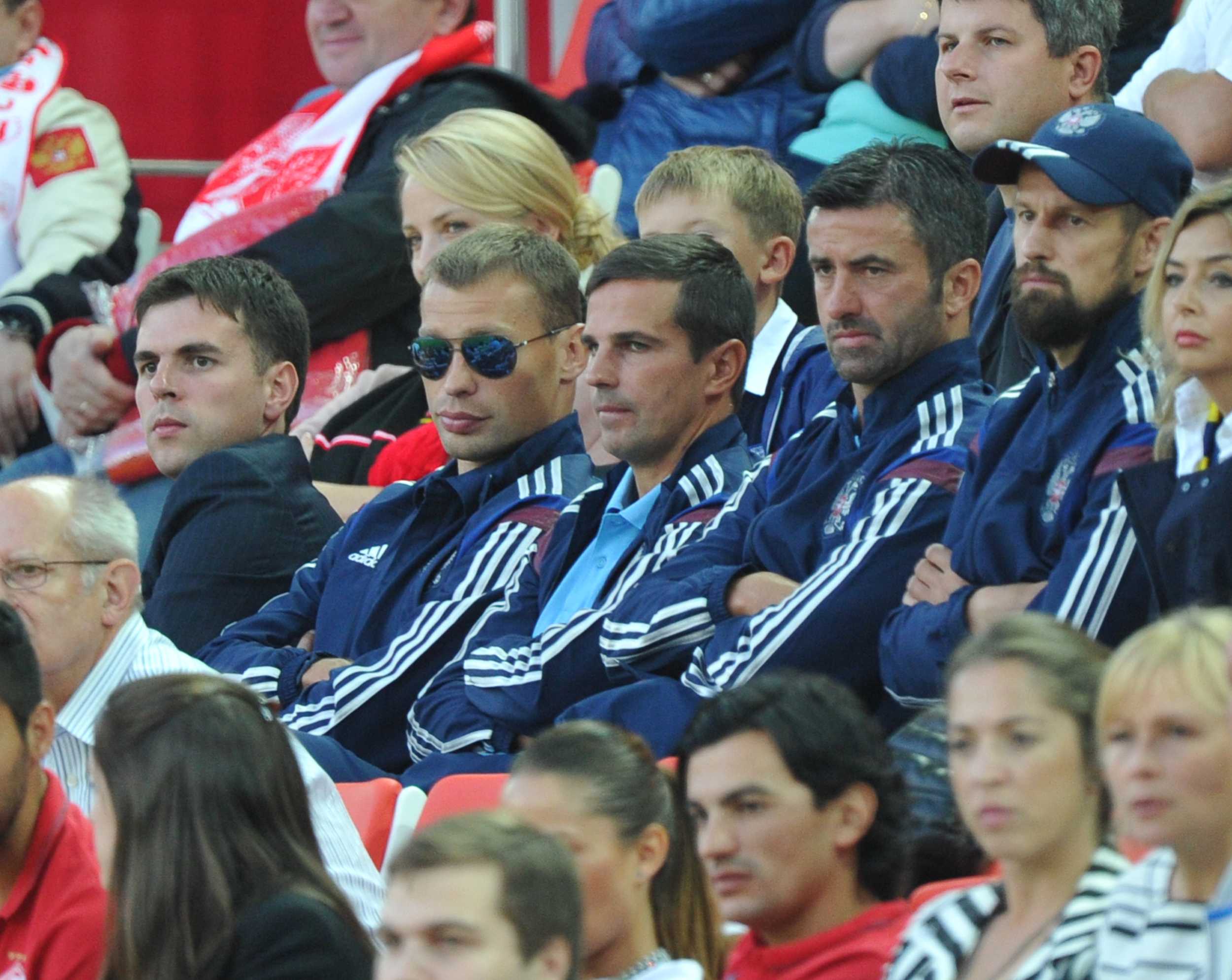 Капитан сборной России, центральный защитник ЦСКА Василий Березуцкий, помощник главного тренера российской сборной Сергей Семак и его коллега Кристиан Пануччи присутствуют на матче "Спартак" – "Црвена Звезда". Перед началом игры они поприветствовали владельца красно-белых Леонида Федуна и министра спорта России Виталия Мутко, готовившихся к произнесению приветственных речей, передают корреспонденты "СЭ" Вячеслав КОРОТКИН и Игорь РАБИНЕР.