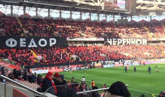 Болельщики "Спартака" перед началом матча 11-го тура премьер-лиги с "Локомотивом" почтили память знаменитого полузащитника красно-белых Федора Черенкова, ушедшего из жизни 4 октября. На фанатской трибуне вывешены большие черные баннеры, на одном из которых написано имя футболиста, на другом - фамилия, а на третьем - даты рождения и смерти. Также игру предваряла минута молчания в память о Черенкове. Впрочем, фанаты красно-белых предпочли проводить свою легенду в английском стиле - аплодируя и скандируя его имя, передает из Тушина корреспондент "СЭ" Филипп ПАПЕНКОВ. (Фото автора)