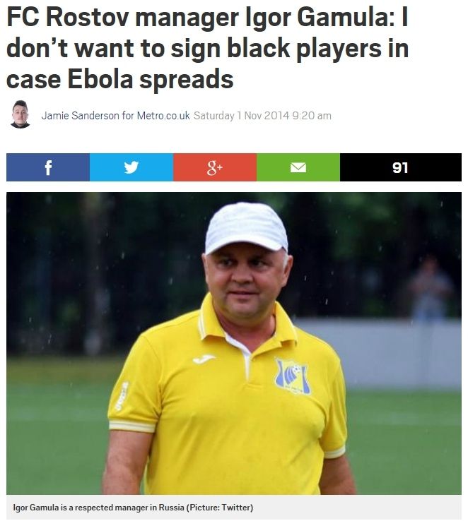 "Тренер "Ростова": "Я не хочу черных игроков в случае распространения вируса Эбола", – написал The Guardian.