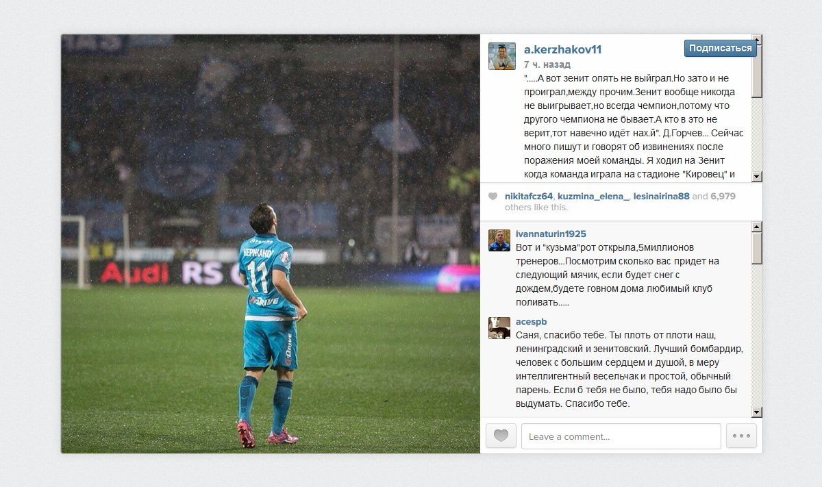 Сейчас много пишут и говорят об извинениях после поражения моей команды. Я ходил на "Зенит", когда команда играла на стадионе "Кировец" и "Обуховец". Я подавал мячи на "Кирова" когда "Зенит" горел "Асмаралу" 0:1, а на трибунах было тысячи три народу. Я играл в 2002 году, когда на последнюю игру сезона с "Крыльями" пришло 8000 человек. К счастью, поражений было достаточно, потому что без них не было бы побед! Как и без того "Зенита" из моего детства не было бы нынешнего! Поражения, как и победы, – это футбол! "Люби "Зенит" больше побед!" – написал Кержаков на своей странице в Instagram.