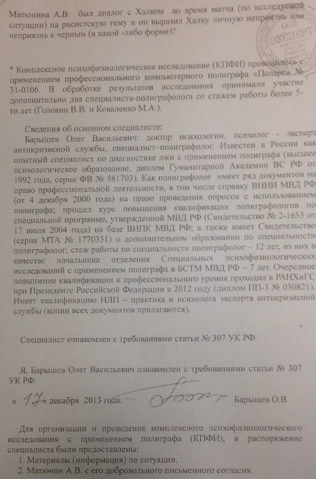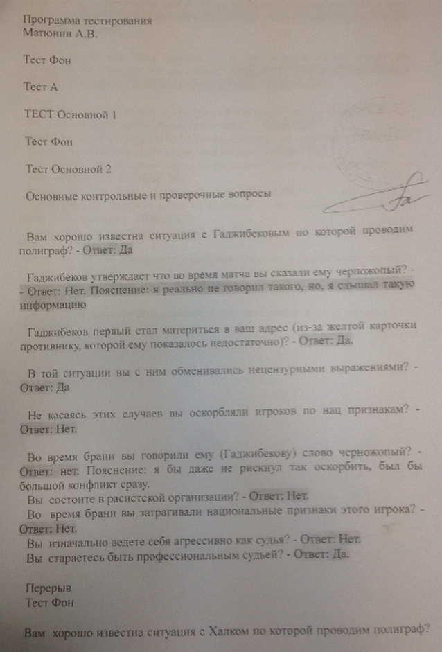 В распоряжение "СЭ" поступило официальное заключение исследования арбитра Алексея Матюнина на детекторе лжи в рамках проведения расследования дела "Халка и Матюнина". Приводим первую часть документов, где арбитр отвечает на вопросы по поводу конфликта с футболистом "Динамо" из Санкт-Петербурга Альбертом Гаджибековым в 2011 году.