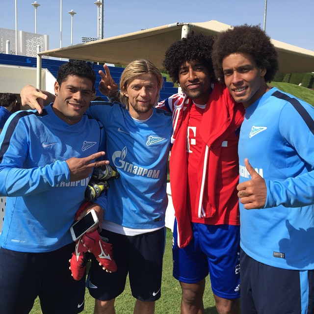 Полузащитники "Зенита" Анатолий Тимощук и Аксель Витсель, а также форвард Халк после сегодняшней утренней тренировки команды сфотографировались с защитником "Баварии" Данте. "Старый друг", - написал в своем Instagram Тимощук, который играл вместе с Данте за мюнхенскую команду. Напомним, что игроки "Баварии" посетили занятие сине-бело-голубых.