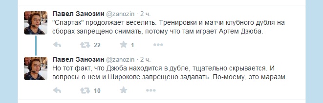 "Спартак" продолжает веселить. Тренировки и матчи клубного дубля на сборах запрещено снимать, потому что там играет Артем Дзюба. Но тот факт, что Дзюба находится в дубле, тщательно скрывается. И вопросы о нем и Широкове запрещено задавать. По-моему, это маразм", - написал Занозин в твиттере.