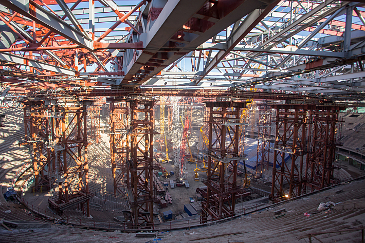 На завершающем этапе находится процесс сборки стационарной крыши: готовы все основные блоки, устанавливаются пилоны и ездовые фермы. Уже начался монтаж раздвижного сегмента и утеплителя. Эти работы будут завершены летом, и сразу после начнется основная стадия отделки арены.