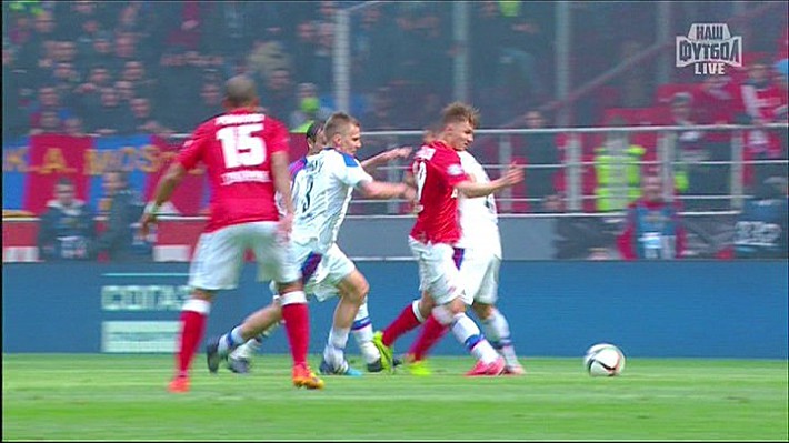 На 74-й минуте матча 28-го тура премьер-лиги "Спартак" - ЦСКА ошибку допустил арбитр Алексей Николаев, не наказавший гостей 11-метровым ударом. У судьи были основания назначить пенальти: Сергей Игнашевич в единоборстве с Денисом Давыдовым нарушил правила. Пытаясь остановить соперника, защитник ЦСКА сделал движение левой ногой навстречу спартаковцу и попал тому в область колена. (Александр БОБРОВ)