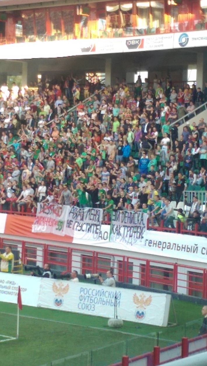 Фанаты "Локомотива" вывесили на матче 29-го тура премьер-лиги с "Кубанью" два баннера, адресованных бывшим полузащитнику команды Денису Глушакову и тренеру Леониду Кучуку, передает из Черкизова корреспондент "СЭ" Егор ЧЕРНОВ. На одном полотне написано "Дядя Леня, не грустите!", на другом – "Эй, Дениска, как трофей?". Напомним, прошлой осенью Кучук при не совсем ясных обстоятельствах покинул пост наставника железнодорожников, а Глушаков после трансфера в "Спартак" в 2013 году заявил, что пришел в клуб за трофеями.