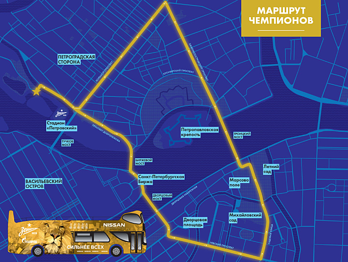 В субботу 30 мая после домашней игры 30-го тура премьер-лиги с "Локомотивом" "Зенит" отправится с "Петровского" в город на открытом золотом автобусе, информирует официальный сайт команды. Около 16:30 сине-бело-голубые проедут от стадиона по проспекту Добролюбова к Биржевому мосту, оттуда – на Стрелку Васильевского острова, через Дворцовый мост на Дворцовую площадь, далее по Невскому до Садовой улицы, к Марсову полю, через Троицкий мост на Каменноостровский проспект до Большого проспекта Петроградской стороны и обратно на "Спортивную". Во время парада игроки и тренеры представят петербуржцам Кубок чемпионов России, который будет вручен команде в этот же день.