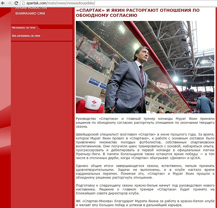 Однако общие итоги завершающегося сезона, естественно, нельзя признать удовлетворительными. Задачи не выполнены, и в клубе настало время кардинальных перемен. Понимая это, "Спартак" и Мурат Якин пришли к обоюдному решению расторгнуть отношения.