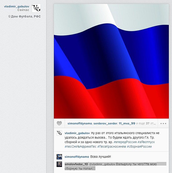 "Валыдя, ну ты чего??!! В мою сборную ты попал! (орфография и пунктуация сохранены. – Прим. "СЭ")" – написал Смолов, который так же, как и Габулов, значился в расширенном списке, но в окончательный не попал.