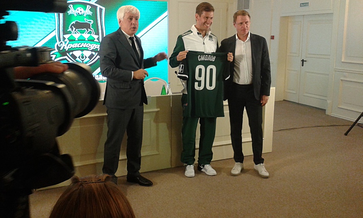 Новичок "Краснодара" Федор Смолов получил игровую футболку на предсезонной пресс-конференции. 25-летний форвард будет выступать за "быков" под 90-м номером.