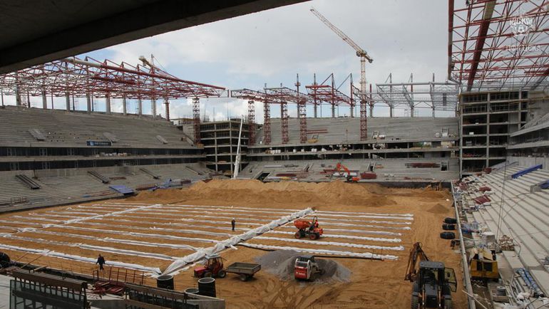После установки козырька над северной трибуной окончательно расчищена от труб площадка под футбольное поле. На южной половине поля уже устанавливают дренажную систему, на оставшейся части начали отсыпать песок. Практически завершено возведение северо-восточного здания, в котором будет располагаться гостиница: работы здесь ведутся уже на заключительном этаже, также вскоре будет закончено северо-западное административное здание.