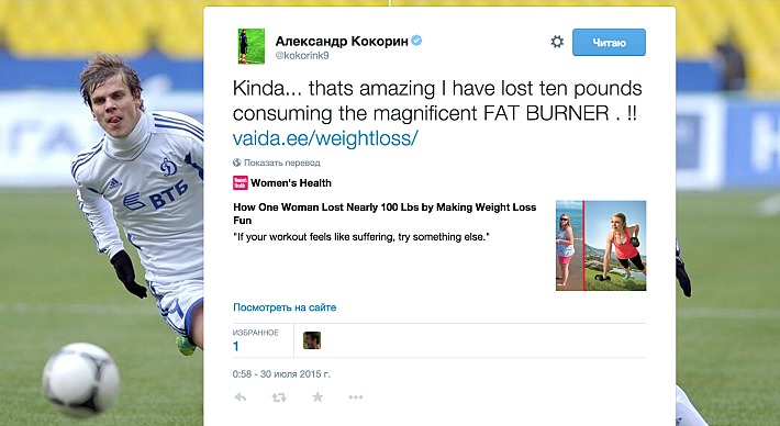 Форвард "Динамо" и сборной России Александр Кокорин, по всей видимости, стал жертвой интернет-преступников. На официальной странице футболиста в твиттере появилось сообщение рекламного характера, в котором игрок якобы утверждает, что ему удалось сбросить около пяти килограммов, используя некое средство для похудения.