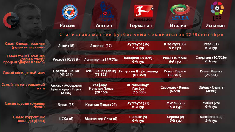 10-й тур чемпионата России, в отличие от предыдущего, оказался не очень результативным. В среднем за матч (а пять из восьми поединков, напомним, завершились вничью) было забито 2,38 гола, что лишь не намного меньше, чем в среднем за матч в испанской ла лиге (2,40), итальянской серии А (2,45) и немецкой бундеслиге (2,89), но заметно меньше, чем в английской премьер-лиге (4,10). При этом российские клубы, хоть и нанесли меньше, чем во всех ведущих чемпионатах Европы, ударов, чаще попадали в створ ворот (8,88 удара в среднем за игру), чем итальянские (7,60) и испанские (8,60). Английские клубы и тут вне конкуренции – 12,0.