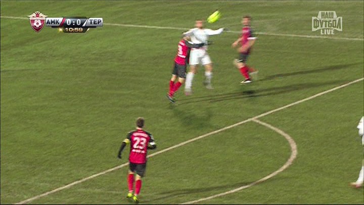 На 11-й минуте матча 14-го тура чемпионата России "Амкар" – "Терек" арбитр Алексей Еськов не назначил 11-метровый удар в ворота хозяев, когда Петар Занев руками задержал Заура Садаева. Защитник за счет фола не пустил соперника к мячу и выиграл единоборство. Судья, который хорошо видел происходившее, продолжил игру, хотя имел основания, чтобы наказать "Амкар" пенальти. Напомним, что встреча закончилась победой пермяков – 1:0. (Александр БОБРОВ)