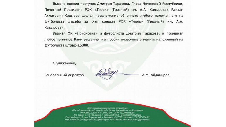 Письмо "Терека" в "Локомотив" с предложением оплатить штраф Тарасова