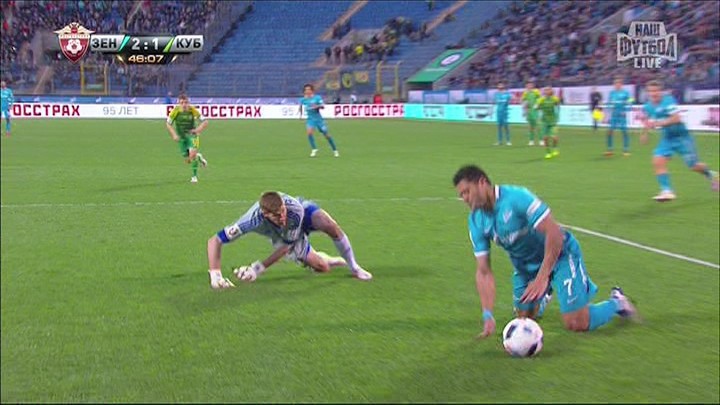 На 46-й минуте матча 26-го тура чемпионата России "Зенит" – "Кубань" арбитр Алексей Николаев верно не назначил 11-метровый удар в ворота гостей, однако ошибочно не вынес Халку предупреждение за симуляцию. Бразилец упал по собственной инициативе, пытаясь обмануть судью. Вратарь "Кубани" Дмитрий Стажила к Халку даже не прикоснулся – ни ногой, ни рукой. (Александр БОБРОВ)