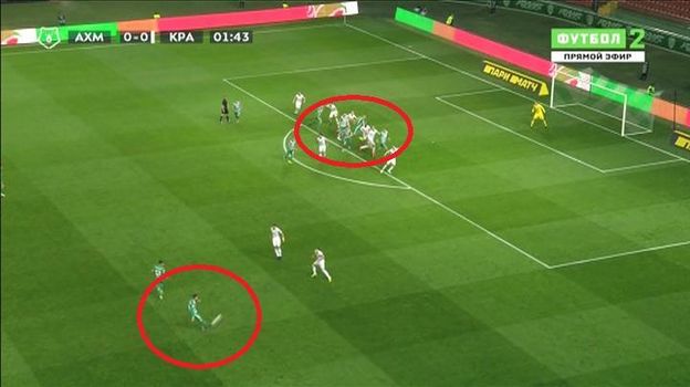 На 2-й минуте матча 25-го тура чемпионата России "Ахмат" - "Краснодар" арбитр Алексей Еськов засчитал взятие ворот гостей после того, как первый ассистент Андрей Болотенков не зафиксировал положение "вне игры" у автора гола Андрея Семенова. Отсутствие видеоповтора, сделанного офсайдной камерой, не позволяет точно оценить расположение защитника грозненцев относительно соперников. Невозможно понять, был Семенов в момент передачи за линией офсайда или нет. (Александр Бобров)