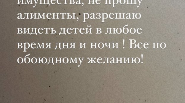 «Мы разводимся! Разводимся мирно и без скандалов. Я не претендую на раздел имущества, не прошу алименты, разрешаю видеть детей в любое время дня и ночи. Все по обоюдному желанию.