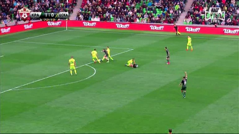 Судья не увидел нарушения правил в действиях Игнашевича, который с фолом остановил Мамаева. Защитник красно-синих "поставил шлагбаум" перед соперником, ударил его в область бедра и слегка подтолкнул в спину. Все это произошло вне пределов штрафной площади ЦСКА. (Александр БОБРОВ)