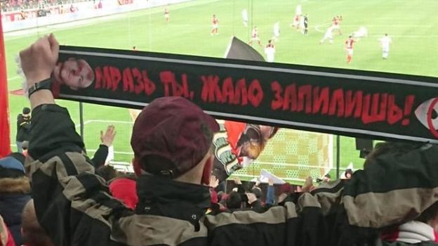 Причина – один из спартаковских фанатов (на вид – около 30 лет) растянул шарф с оскорблениями в адрес капитана красно-белых Дениса Глушакова. С ним он стоял на протяжении всего первого тайма.