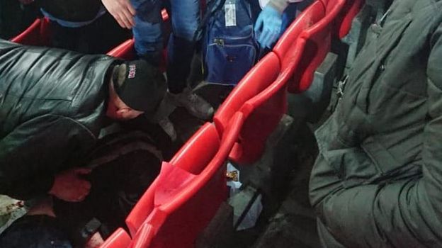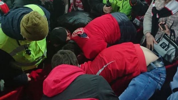 Потом около 5 минут они переругивались, а в перерыве – снова подрались. Болельщик с шарфом атаковал противников, но был избит сам – ему противостояли около десятка человек. Фаната сильно избили – он упал без сознания (причем несколько ударов ему нанесла девушка), а его другу разбили нос. В результате побитого болельщика, через несколько минут пришедшего в сознание, унесли с сектора на носилках.