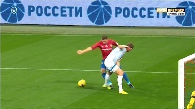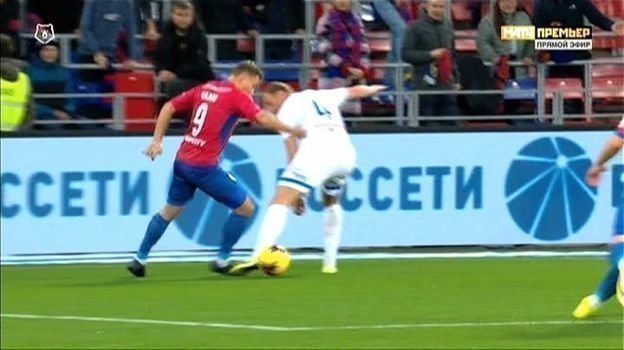 Динамовец сделал подножку Федору Чалову, ударив его по голеностопу правой ноги. Такой фол в штрафной площади наказывается 11-метровым ударом, однако рефери продолжил игру.