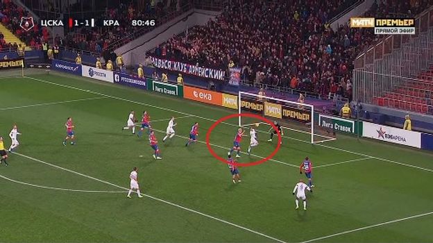 Если судить по одному повтору (камерой сверху), то Игнатьев находился на одной линии с защитником ЦСКА. Значит, ни о каком офсайде речи быть не может.