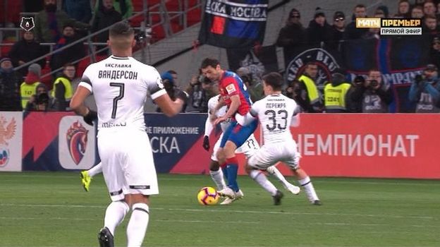 Судья неверно оценил единоборство Маурисио Перейры с Аланом Дзагоевым и продолжил игру. Хотя следовало наказать футболиста "быков" 11-метровым - он, не пытаясь сыграть в мяч, в своей штрафной площади задержал соперника двумя руками. (Александр Бобров)
