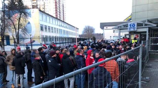 Болельщиков "Спартака" при входе на "Арену Химки", где пройдет матч 19-го тура чемпионата России против "Динамо", серьезно досматривают. Некоторым приходится раздеваться до трусов.