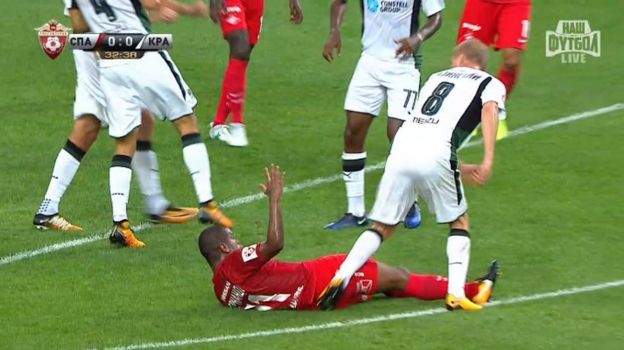 А секундами ранее на другой половине поля Газинский в красках устно объяснял сопернику, что не нужно падать на ровном месте. Фернанду же, поднимаясь с газона, уткнулся головой в грудь оппонента и, изображая получение серьезной травмы, снова упал, держась за лицо.