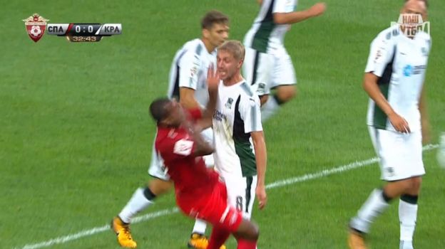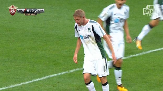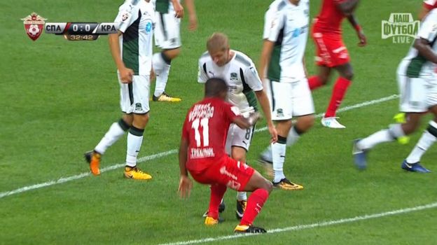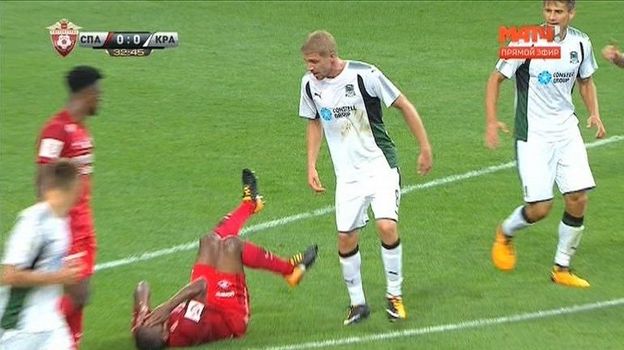 Хавбек красно-белых Фернанду попытался обыграть Юрия Газинского и оказался на газоне, однако арбитр Сергей Лапочкин не усмотрел нарушения со стороны полузащитника "быков", после чего переключил внимание на контратаку краснодарцев.