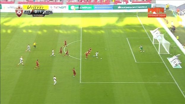 На 17-й минуте матча 1-го тура чемпионата России "Рубин" – "Краснодар" правильное решение приняла бригада арбитров, засчитав взятие ворот хозяев поля. В момент передачи Маурисио Перейры автор забитого мяча Рикардо Лаборде не находился за линией офсайда. Первый ассистент Антон Кобзев правильно не зафиксировал положение "вне игры", и судья Евгений Турбин засчитал гол. (Александр БОБРОВ)