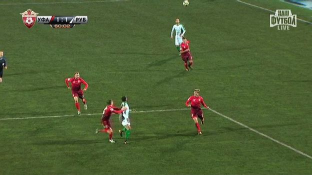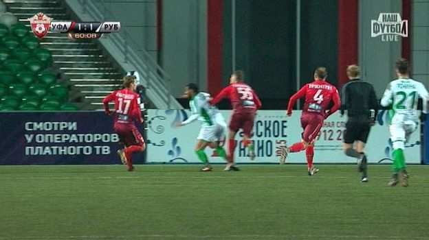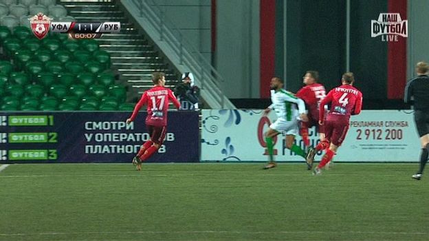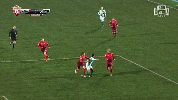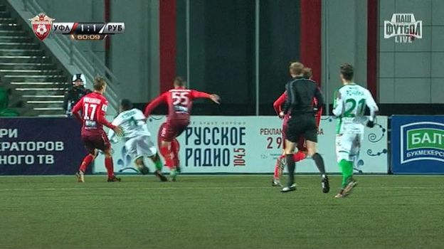 На 60-й минуте матча 15-го тура чемпионата России "Уфа" – "Рубин" (2:1) арбитр Сергей Иванов не наказал хозяев поля пенальти. В том эпизоде Янн М'Вила собирался принять верховую передачу в штрафной площади "Уфы", а Джемал Табидзе толкнул его в спину. Судья 11-метровый удар не назначил и жестом показал, что игроку казанской команды нужно подниматься с газона. (Александр БОБРОВ)