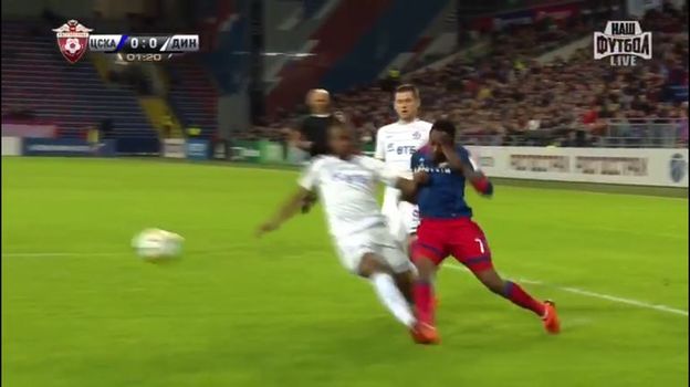 В том моменте полузащитник бело-голубых Самба Соу в своей штрафной площади попытался выбить мяч у форварда красно-синих Ахмеда Мусы?, но промазал, ударил соперника по правому голеностопу и сбил нападающего ЦСКА. Карасев продолжил игру, хотя должен был назначить пенальти. (Александр БОБРОВ)