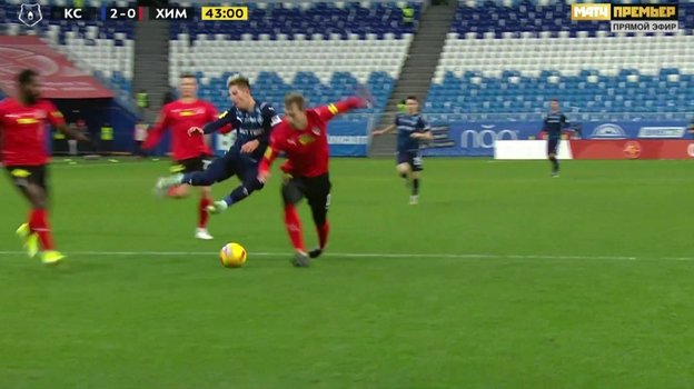На 14-й минуте в штрафной площади гостей упал Мехди Зеффан. Пенальти назначен не был. Решение Любимова и его видеоассистентов Алексея Матюнина и Ильи Елеференко, пожалуй, можно поддержать. Контакт ноги защитника «Химок» Максима Карпова с ногой соперника был минимальный, вряд ли его можно считать причиной падения.