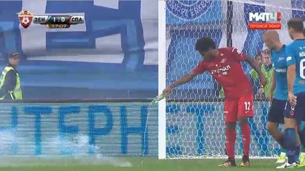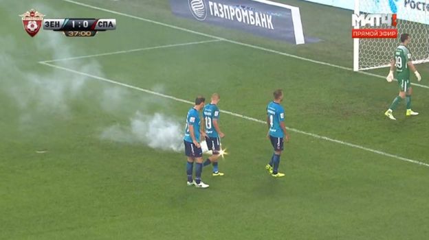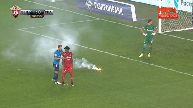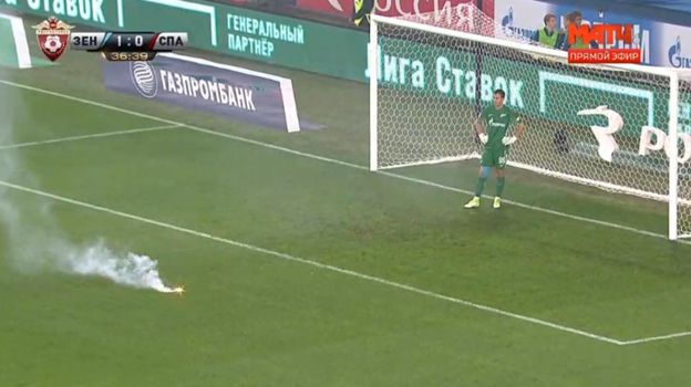 После гола нападающего "Зенита" Александра Кокорина в матче 4-го тура чемпионата России против "Спартака" на 37-й минуте болельщики хозяев поля бросили в штрафную площадку своей команды файер.