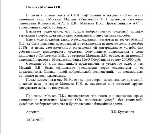 «Еще в ходе предварительного следования, несмотря на то, что Ушакова не была признана потерпевшей и гражданским лицом по делу, в декабре 2018 года в целях своевременного возмещения ей материального ущерба, как собственнику транспортного средства, получившего повреждения в ходе инцидента с Соловчуком В.Н., со стороны Мамаева осуществлен именной денежный перевод на сумму 200 тысяч рублей. Сведения об этом представлены в уголовное дело, о чем Ушакова была официально уведомлена через следователя и ее представителя. Однако, такой добровольной компенсацией по неизвестным причинам не воспользовалась.