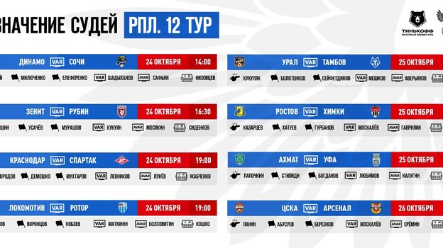 Стали известны судейские назначения на матч 12-го тура Тинькофф-РПЛ. Игру «Краснодар» — «Спартак» судит бригада арбитров во главе с Владиславом Безбородовым.