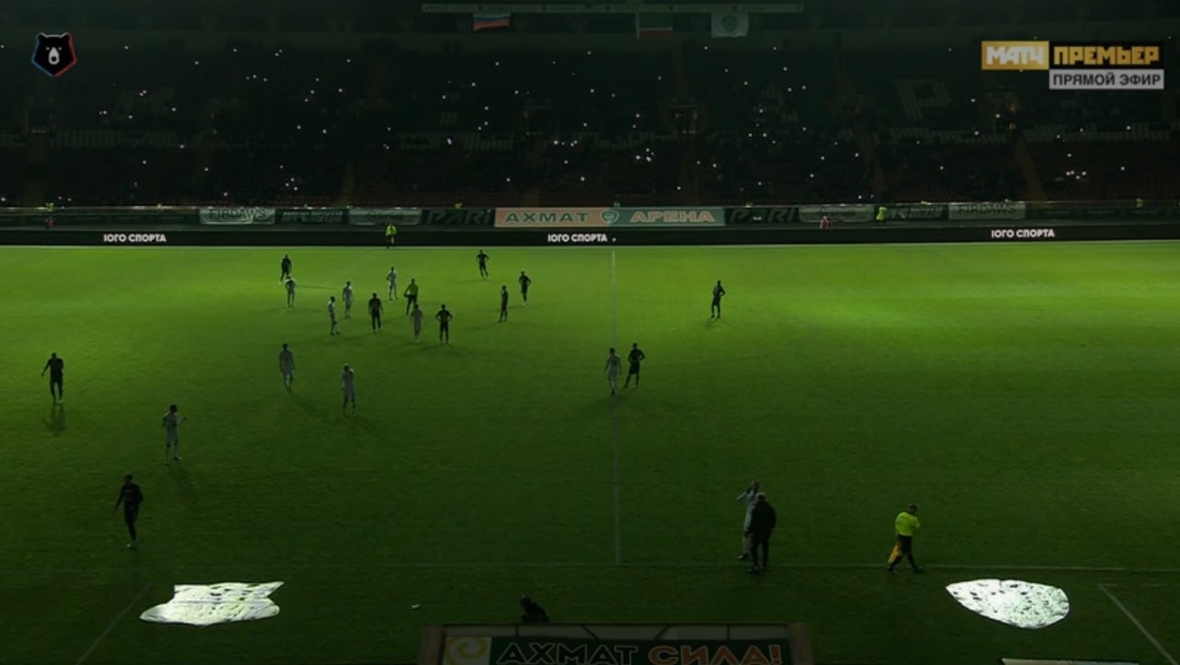 Неполадки произошли на 69-й минуте. Как сообщила пресс-служба «Ахмата», команды возобновят игру через 15 минут. Судья Ян Бобровский отправил футболистов в раздевалку.