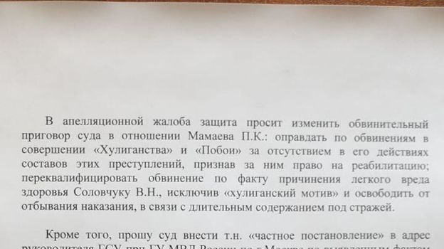 "В апелляционной жалобе защита просит изменить обвинительный приговор суда в отношении Мамаева П.К.: оправдать по обвинениям в совершении "Хулиганства" и "Побои" за отсутствием в его действиях составов этих преступлений, признав за ним право на реабилитацию; переквалифицировать обвинение по факту причинения легкого вреда здоровья Соловчуку В.Н.,. исключив "хулиганский мотив" и освободить от отбывания наказания в связи с длительным содержанием под стражей". (Дмитрий Зеленов)