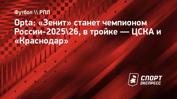 Opta: «Зенит» станет чемпионом России-2025/26, в тройке — ЦСКА и «Краснодар»