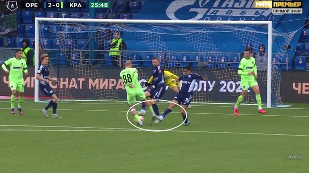 В том эпизоде краснодарец нанес удар по воротам, а через мгновение получил удар шипами по голеностопу. Оренбуржец сделал «накладку», опасно атаковав соперника. Судье следовало наказать его 11-метровым ударом и желтой карточкой.