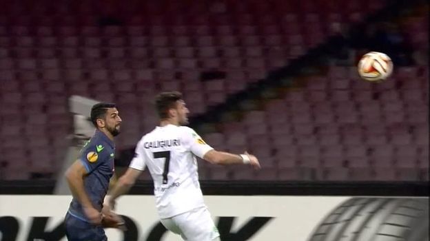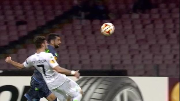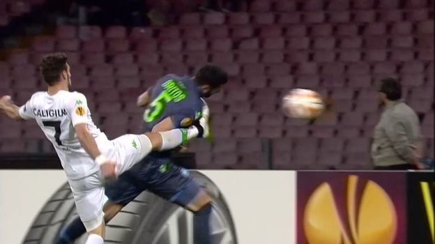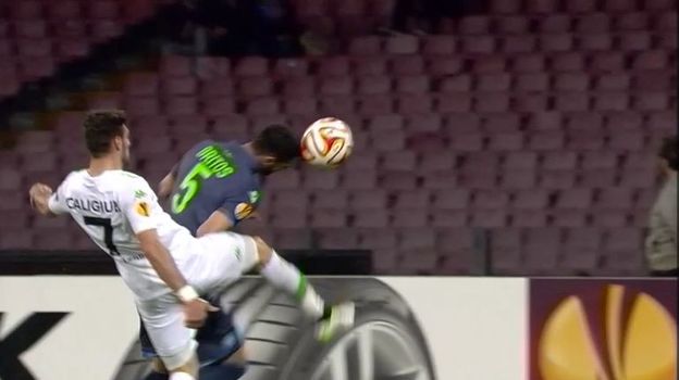 В частности, УЕФА приводит один из моментов матча Лиги Европы-2014/15 между "Наполи" и "Вольфсбургом", в котором нарушает правила игрок германской команды Даниэль Калиджури, ударивший ногой Мигеля Бритоса.