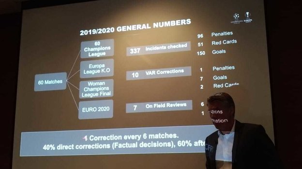 — Если мы посмотрим прошлый сезон, то ВАР вмешивался в процесс в среднем в каждом из 2,4 матча различных турниров УЕФА, — сказал Розетти в рамках семинара ВАР. — Очень люблю следующий факт: в прошлом сезоне было четыре финала турнира УЕФА с использованием ВАР. Что очень важно, во всех четырех финалах не было ни одного вмешательства ВАР в решение арбитров. В 60 матчах этого сезона лишь — одно вмешательство ВАР за шесть матчей. То есть на 60 матчей у нас было 10 вмешательств.